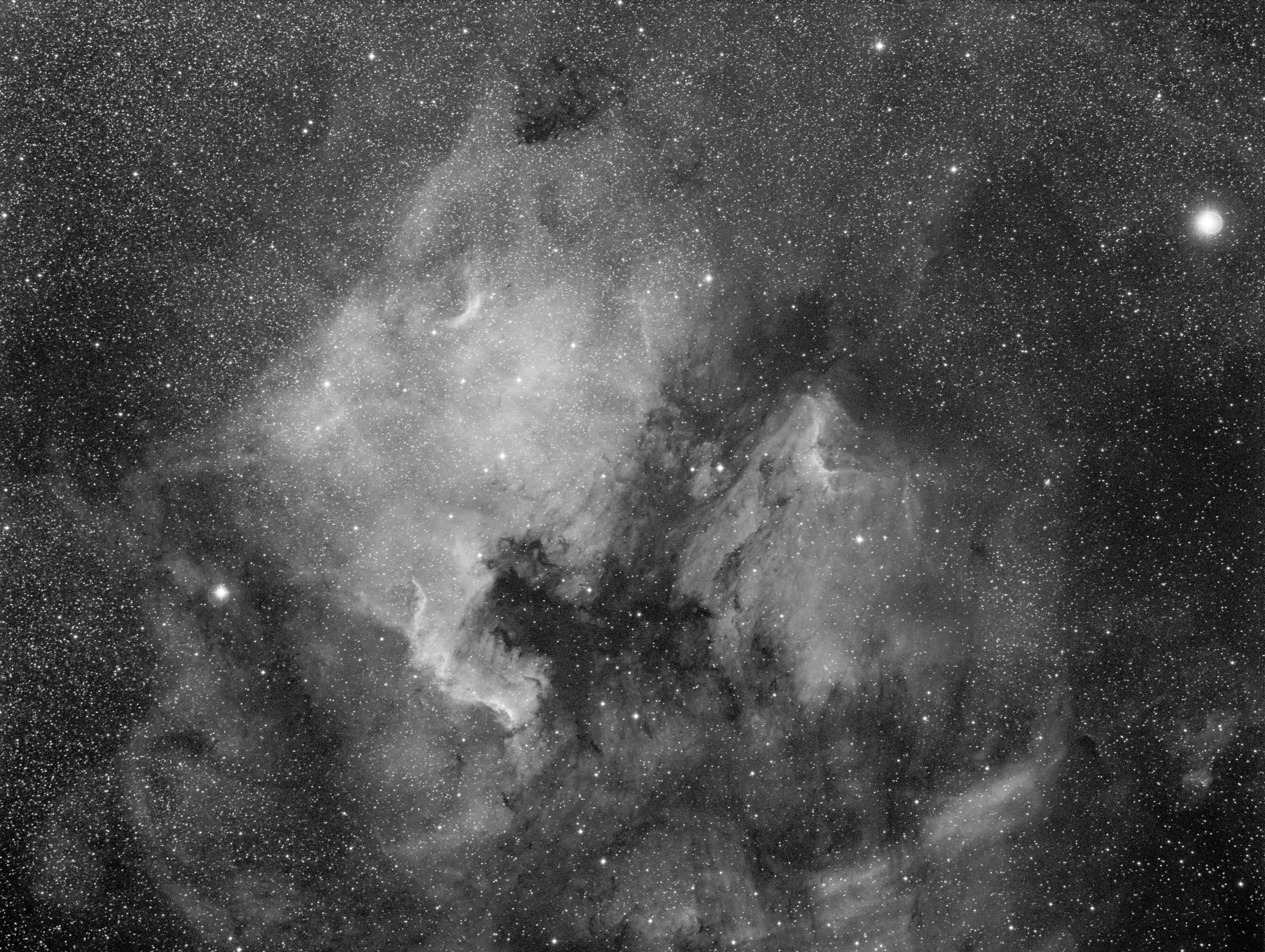 (Click to enlarge) This image © Copyright 2018, Michael Fulbright North American and Pelican Nebula area Canon 200mm lens stopped to f/4 Baader UV/IR filter on front of lens FLI ML8300 5 x 10 minutes Astronomik H-alpha Date: 06/03/2009