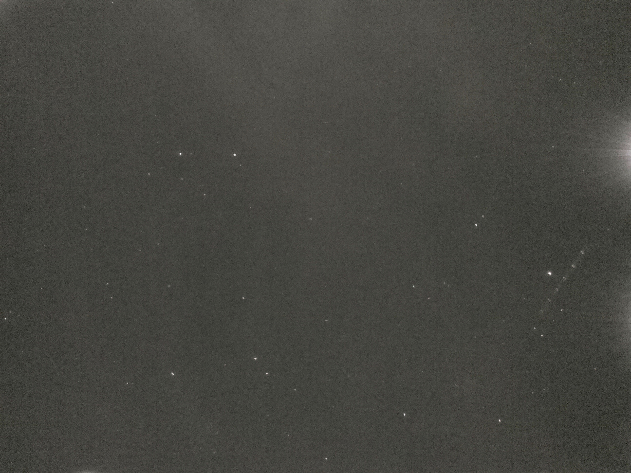 (Click to enlarge) Frame from Raspberry Pi sky camera - Gemini on left and Auriga on right (and airplane on far right). Some clouds present or otherwise background would be darker. Captured with command: raspistill -o img_%04d.jpg -t 50000000 -tl 0 -ss 5900000 -ISO 800 -sa -75 -bm --width 1296 --height 972 --nopreview | Frame from Raspberry Pi sky camera - Gemini on left and Auriga on right (and airplane on far right). Some clouds present or otherwise background would be darker. Captured with command: raspistill -o img_%04d.jpg -t 50000000 -tl 0 -ss 5900000 -ISO 800 -