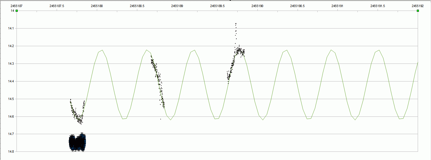 (Click to enlarge) Preliminary look at (627) Charis over 3 nights. Unfiltered. Curve is a sine wave with a period of 0.575 days and an amplitude of 0.2 mag. Spike on third night is from field star entering photometric aperture and will be accounted for in final analysis. | Preliminary look at (627) Charis over 3 nights. Unfiltered.