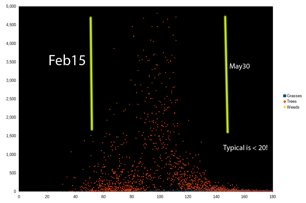 (Click to enlarge) This image © Copyright 2018, Michael Fulbright Pollen counts for last 17 years for Raleigh NC. I only show Spring. X axis is "Day Number", Y axis is pollen count. Typical value rest of year is < 20 most days! Date: 02/25/2017