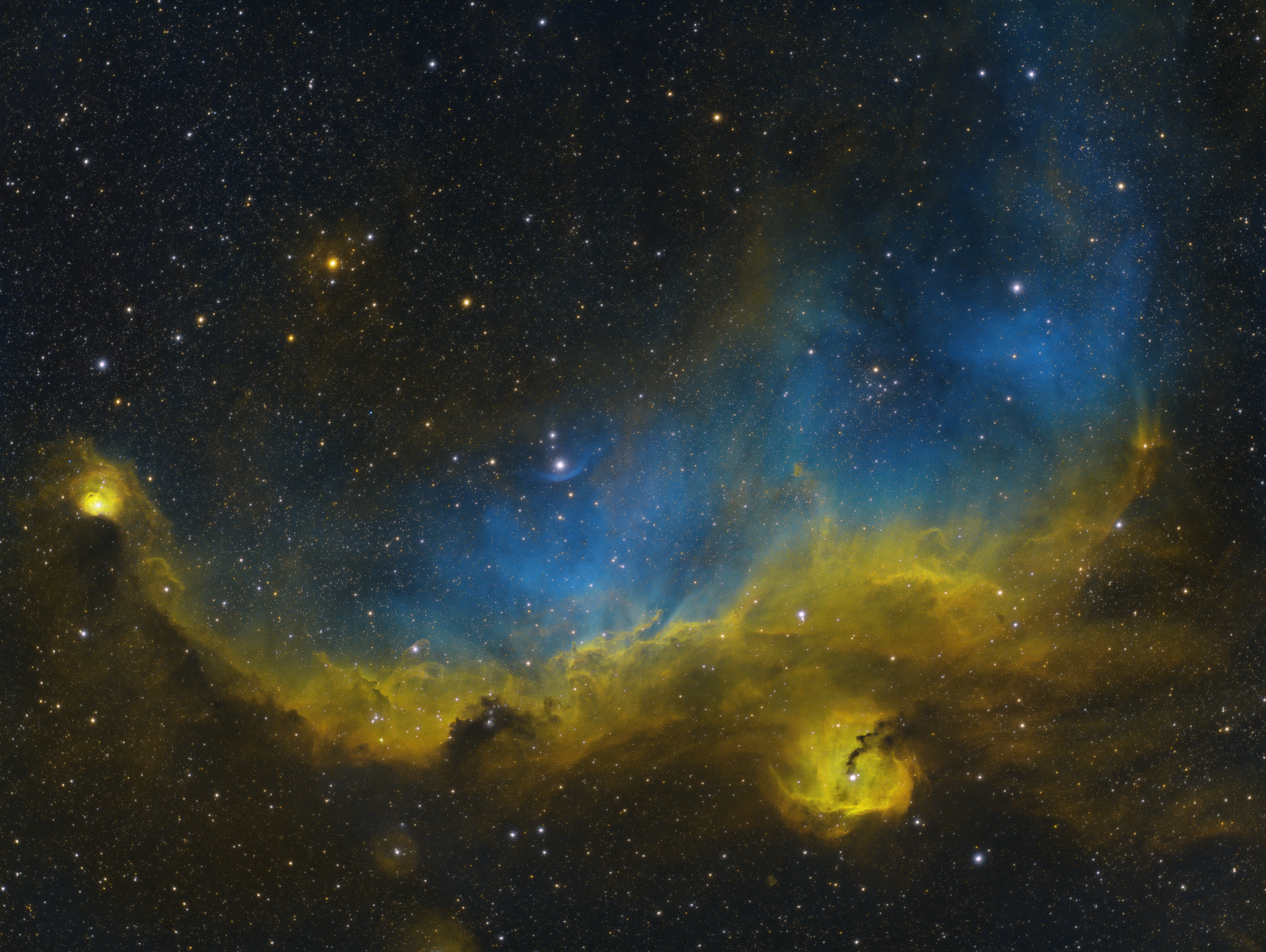 (Click to enlarge) Date: 11/23/2017 Telescope: Stellarvue SV70T Mount: Astro-Physics Mach1GTO Camera: ZWO ASI1600MM-Cool Exposure: Astrodon Ha 1.25" 5nm: 45x300" (gain: 200.00) -20C bin 1x1, Astrodon OIII 1.25 3nm: 70x300" (gain: 200.00) -20C bin 1x1, Astrodon SII 1.25 3nm: 80x300" (gain: 200.00) -20C bin 1x1 |