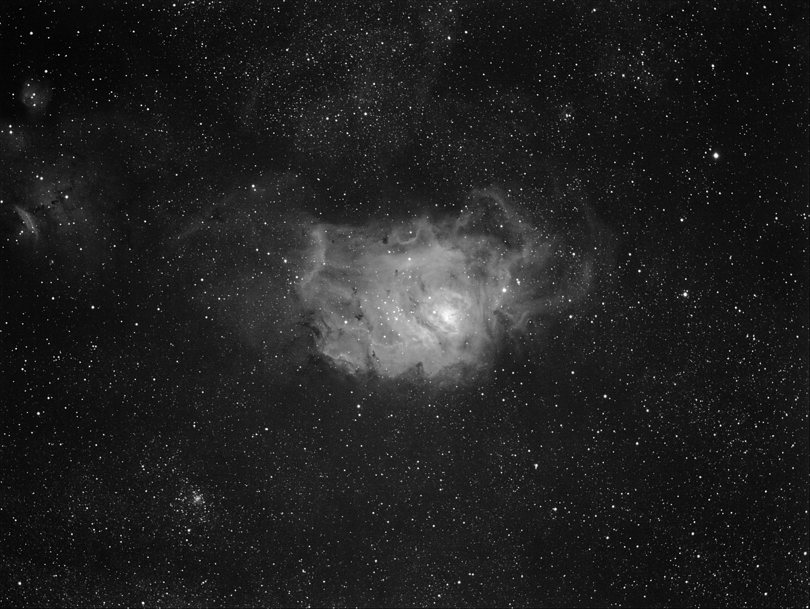 Combine of 10 minute and 15 minute H-alpha shots of M8 with TMB 80. Moon was nearby so even with H-alpha filter background counts were intense.