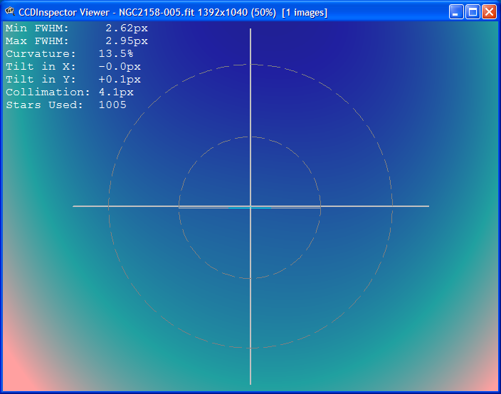 The sky conditions were not good the night I attempted this collimation. There were thin clouds and seeing was predicted to be average at best. Nonetheless I took some test frames of NGC 2158 before shutting down for the night. Here is some CCDInspector analysis of the test frame: