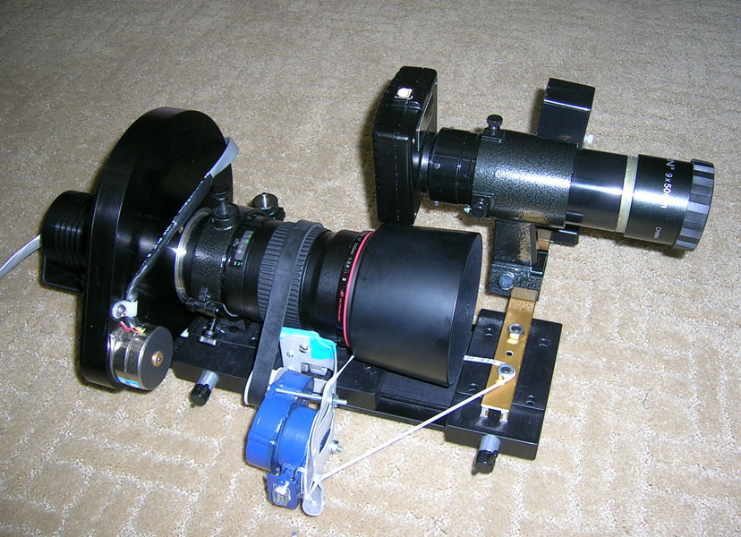 I found a vacuum cleaner belt at the local hardware store which fit snuggly around the SLR lens focus ring and the sprocket on the Robofocus motor. Everything is either on a sliding platform or has lots of screw holes so I can move everything around until its snug and then I tighten all the parts down. Then I added the all important rubber band you can see in the picture to keep the belt well tensioned. The belt is still loose enough that if the lens hits its stop at either end of it focus travel that the belt will slip and not bind up the stepper motor.