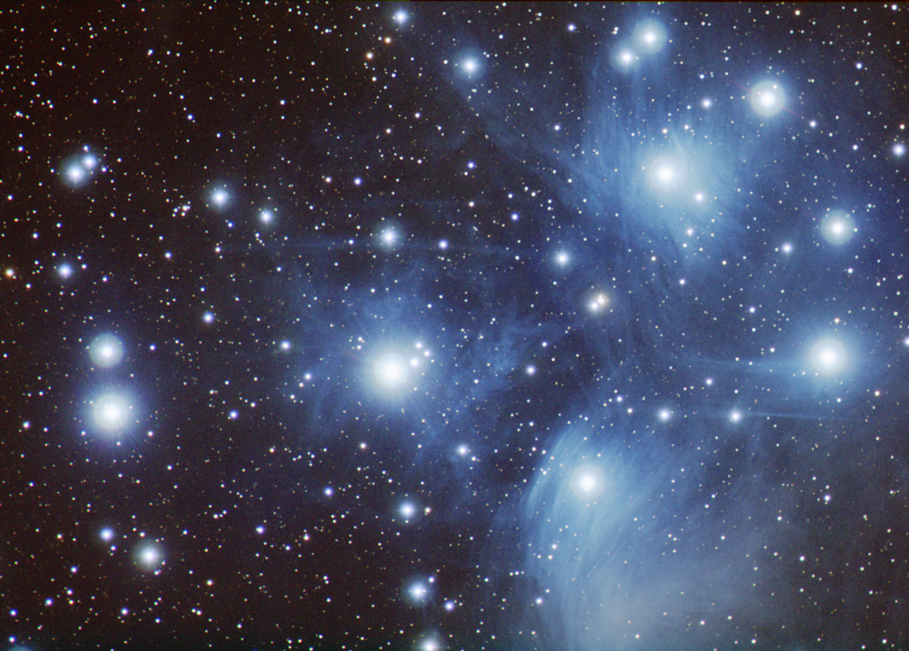 (Click to enlarge) This image © Copyright 2018, Michael Fulbright I decided to try M45 again from a dark spot in NC called Doughton Park. Its at about 3500 feet and the conditions were excellent. Date: 10/07/2007 Telescope: Takahashi Sky 90 + focal reducer (F/4.1) Mount: Atlas EQ-G Camera: SXV-H9 Exposure: RGB: 10 x 3 minutes each