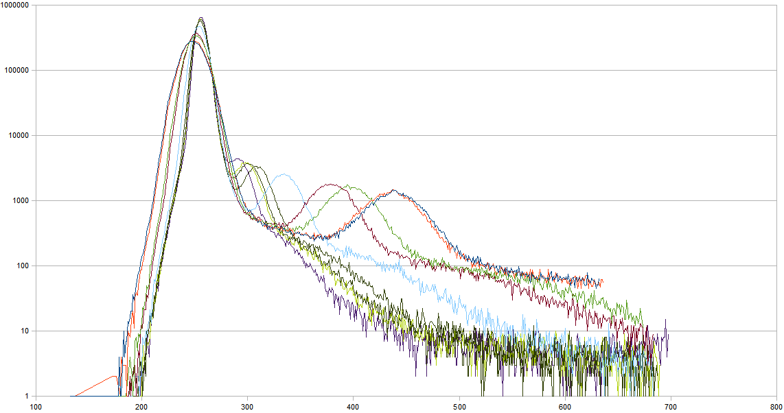 Histogram of a sequence of 300s dark frame at ISO 800. Canon Rebel XT Camera was cooled from 85F to 45F