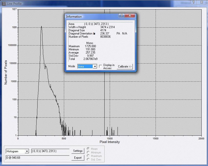 600s ISO 800 Dark Frame Canon Rebel XT Histogram and Standard Deviation with Hot Pixels Removed